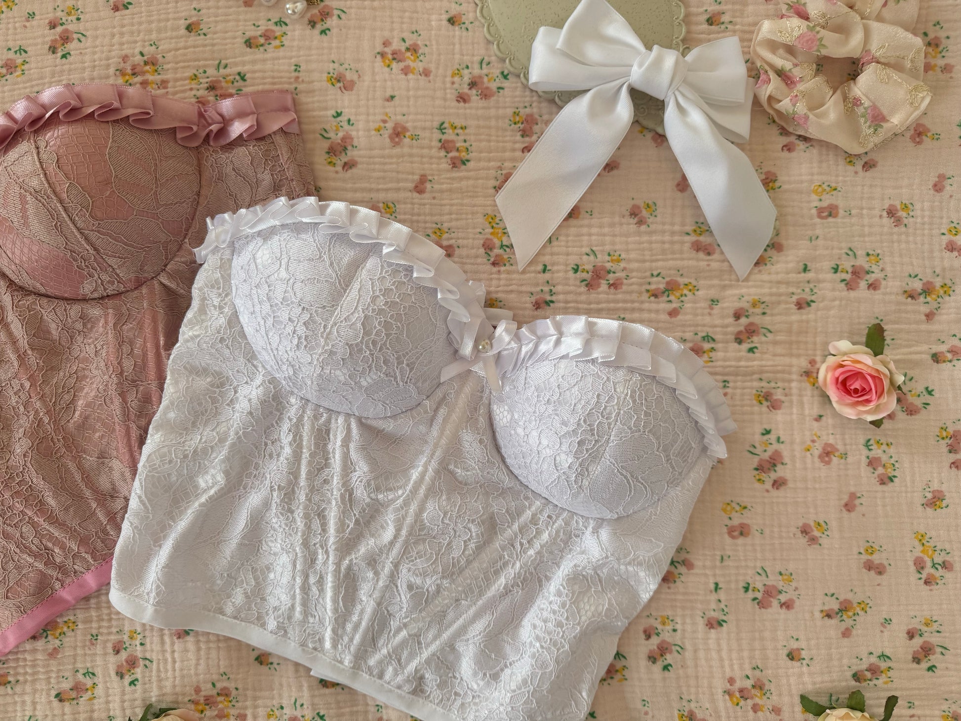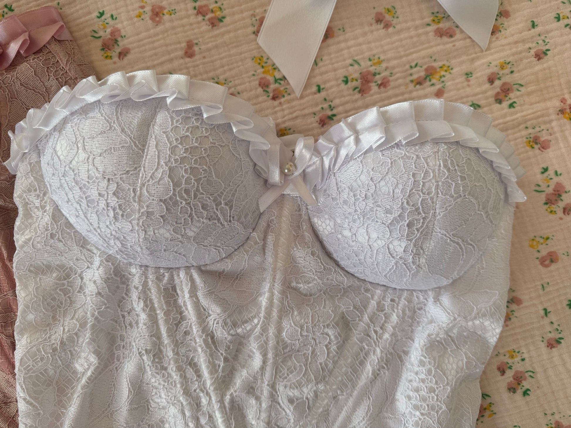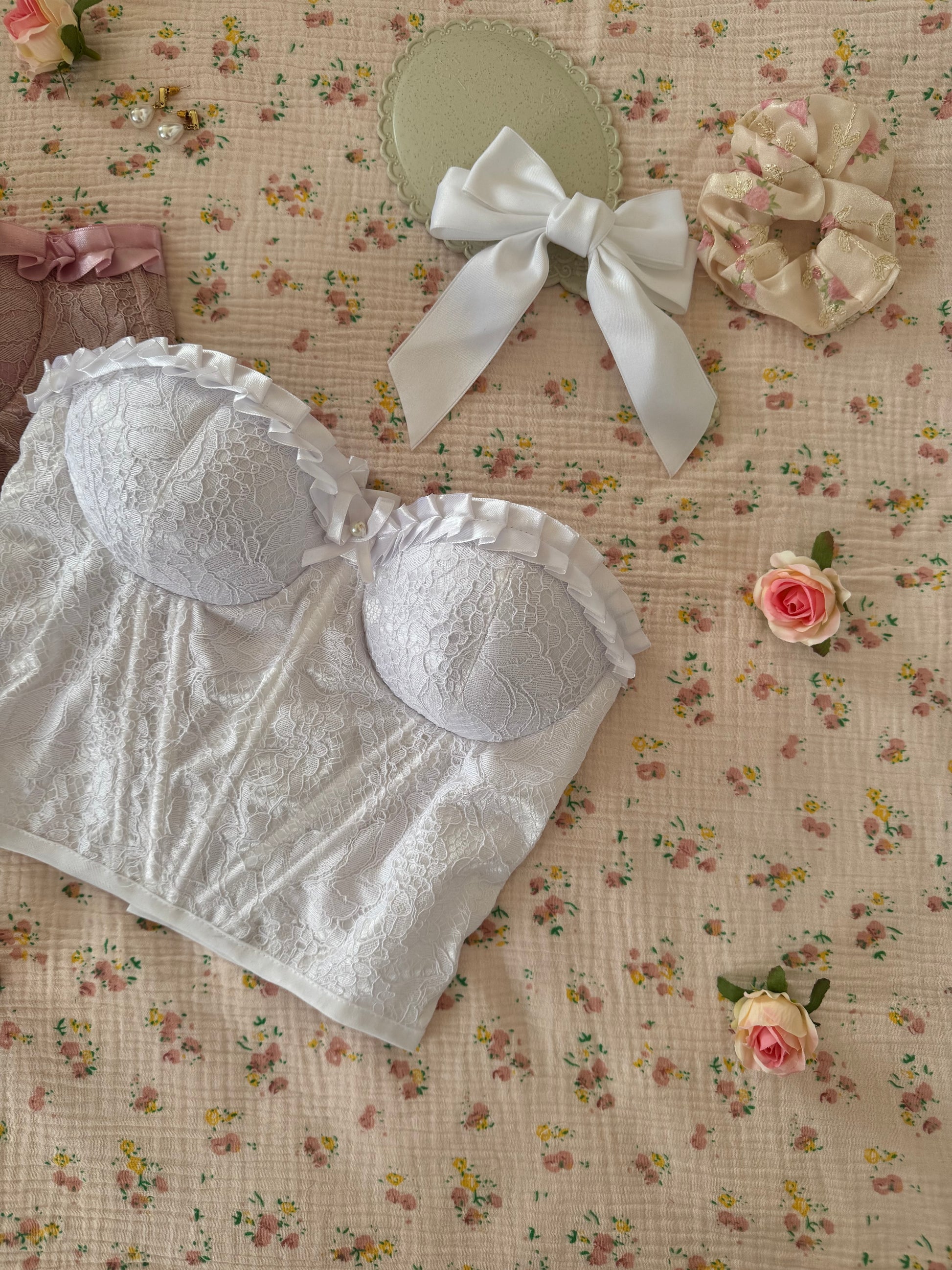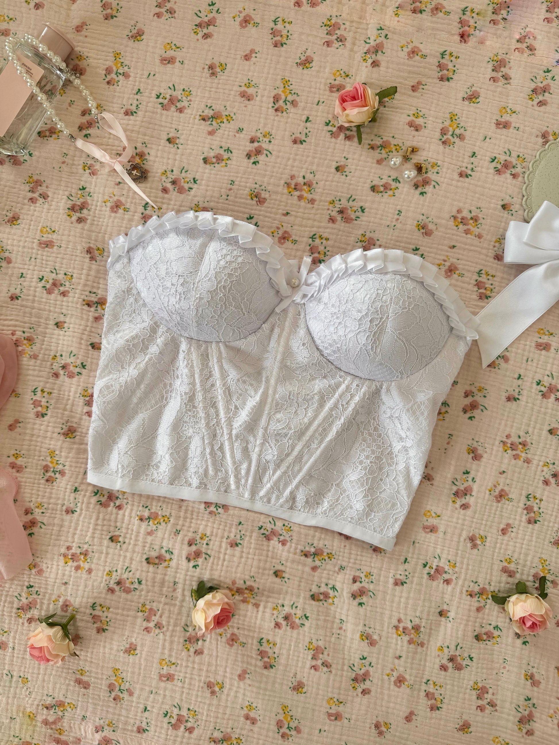 Il bustino Klea, ispirato alla dea della gloria, è un capolavoro di eleganza e prestigio. Realizzato in un raffinato tessuto bianco, questo bustino incarna la luminosità e la grazia di Klea. Le coppe sono ornate da un delicato nastro di seta, che si intreccia armoniosamente e culmina in un fiocco con una perla al centro, aggiungendo un tocco di lusso e raffinatezza.