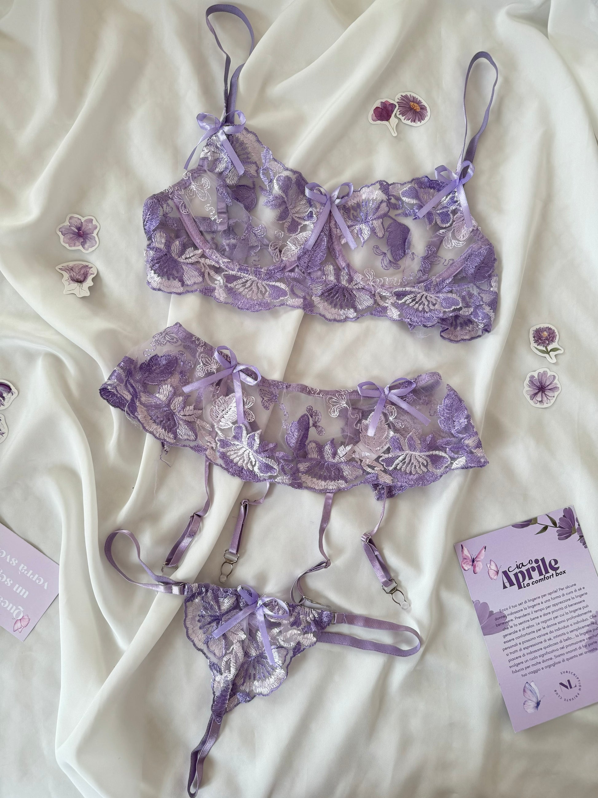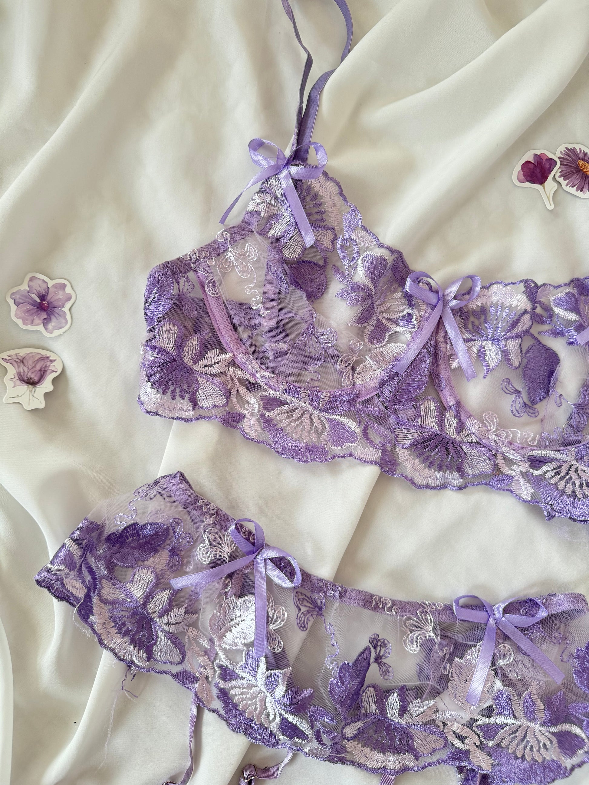 Esplora la tua connessione con la natura con il nostro incantevole set di lingerie ispirato a Lavantha, la ninfa della lavanda. Realizzato in un delicato colore lilla e adornato con fiori ricamati e fiocchetti, questo set a tre pezzi trasuda eleganza e serenità.