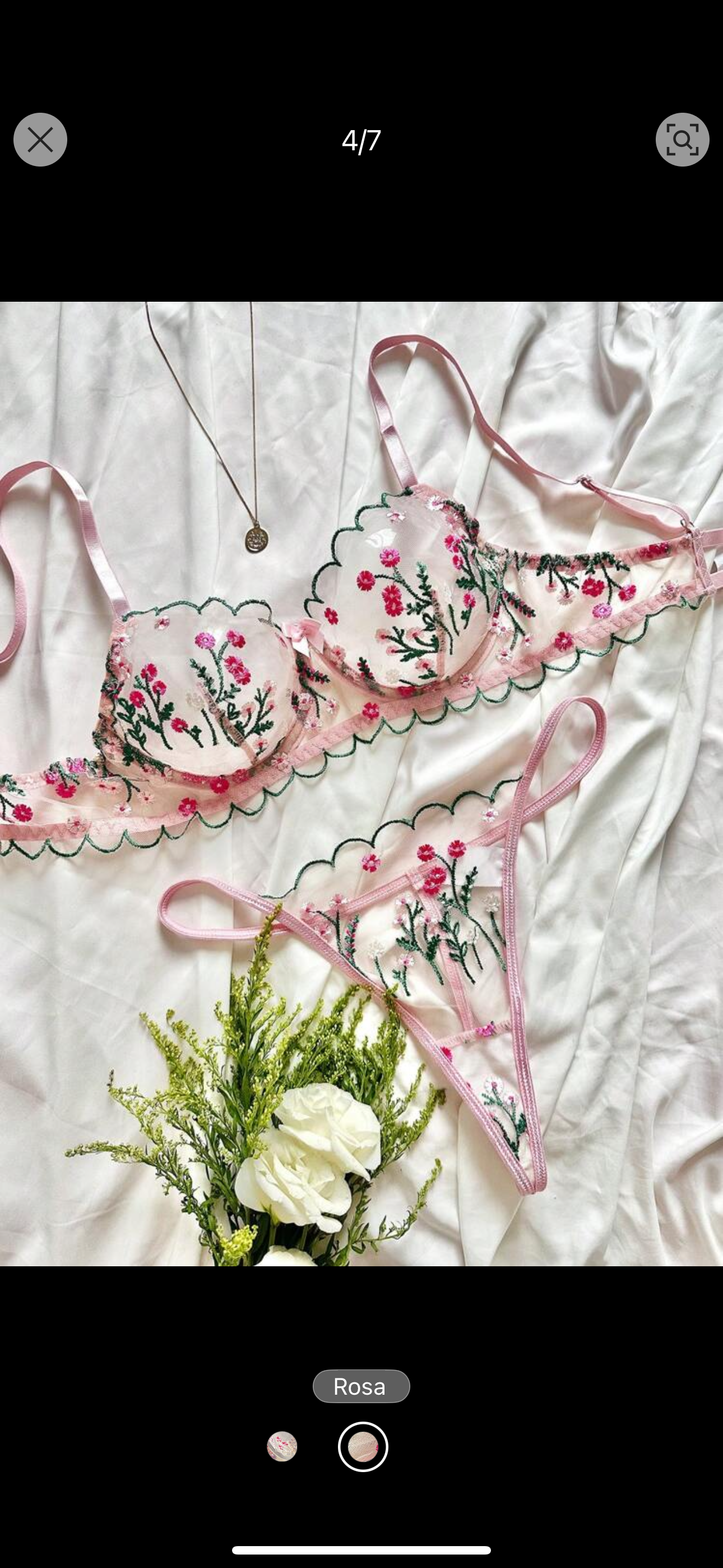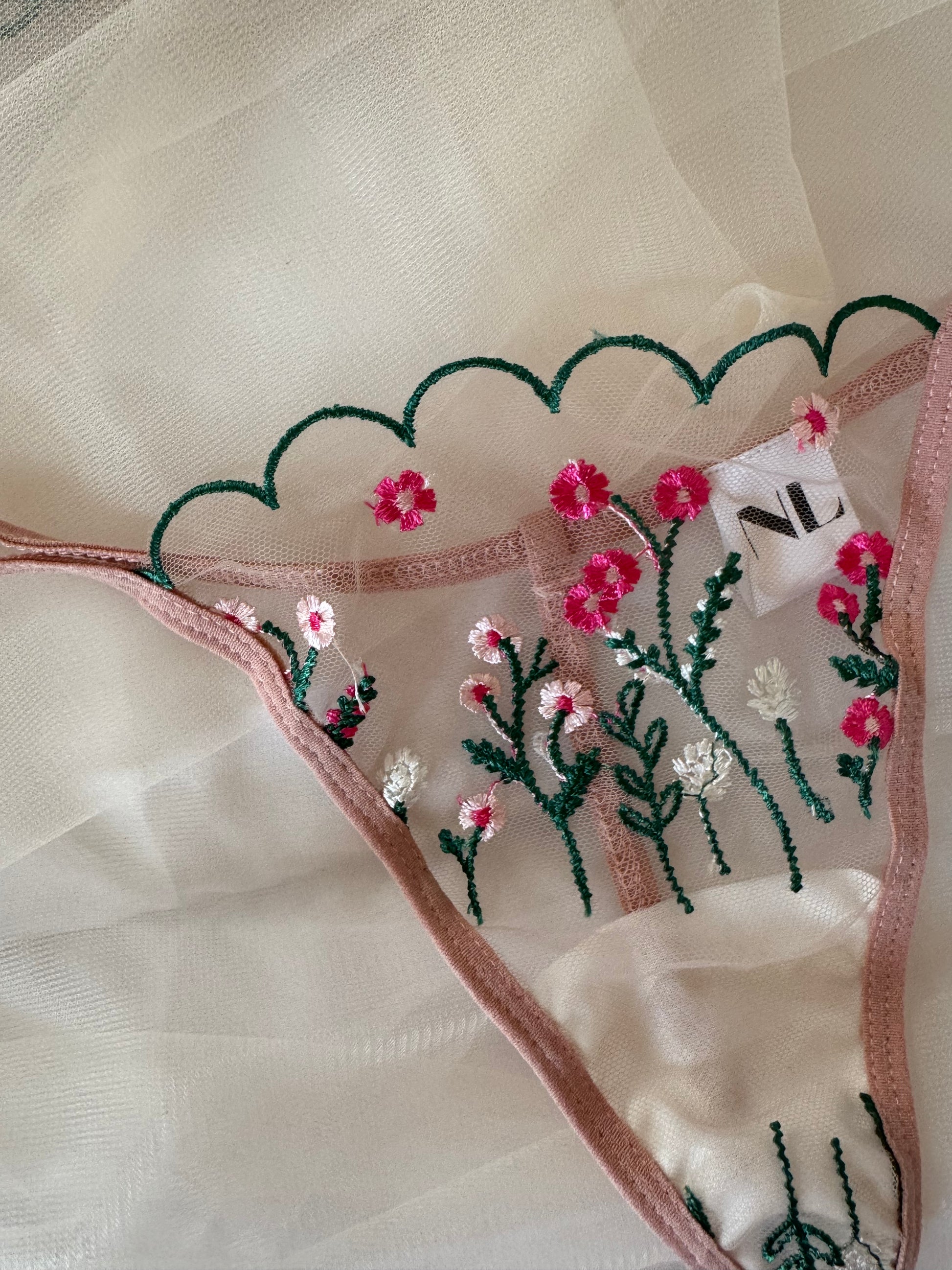 Realizzato in morbida rete rosa, il reggiseno con ferretto e lo slip sono impreziositi da sofisticati ricami floreali in verde matcha, evocando la freschezza di un giardino segreto. Le bretelle regolabili assicurano una vestibilità perfetta, mentre i dettagli floreali trasformano ogni capo in un'opera d’arte dal fascino incantato.
